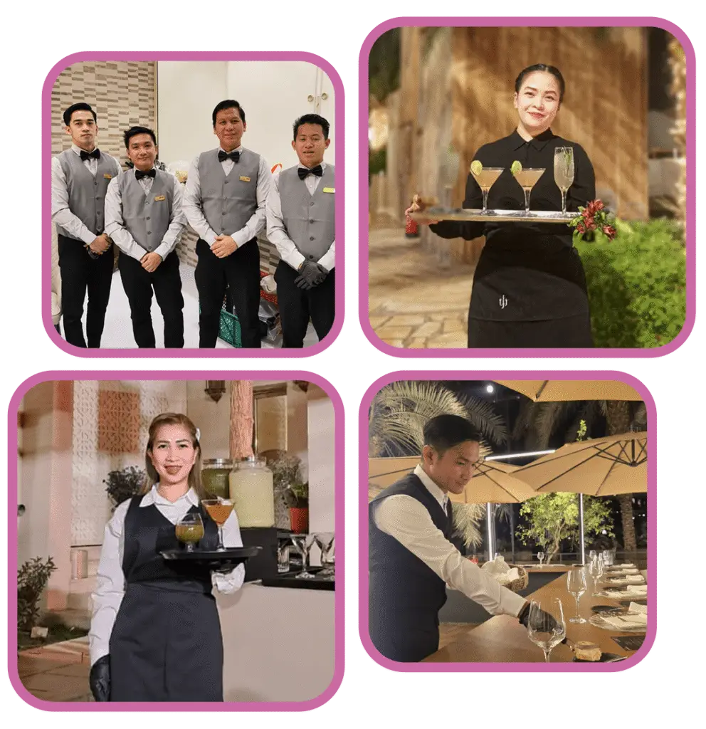 يضم فريقنا مجموعة من المحترفين المدربين تدريبًا عاليًا في مجال الضيافة، الفعاليات، وإدارة المناسبات. جميع أفراد طاقمنا حاصلون على شهادات معترف بها وخضعوا لاختبارات تأهيلية تضمن تقديم خدمة راقية وفق أعلى المعايير.